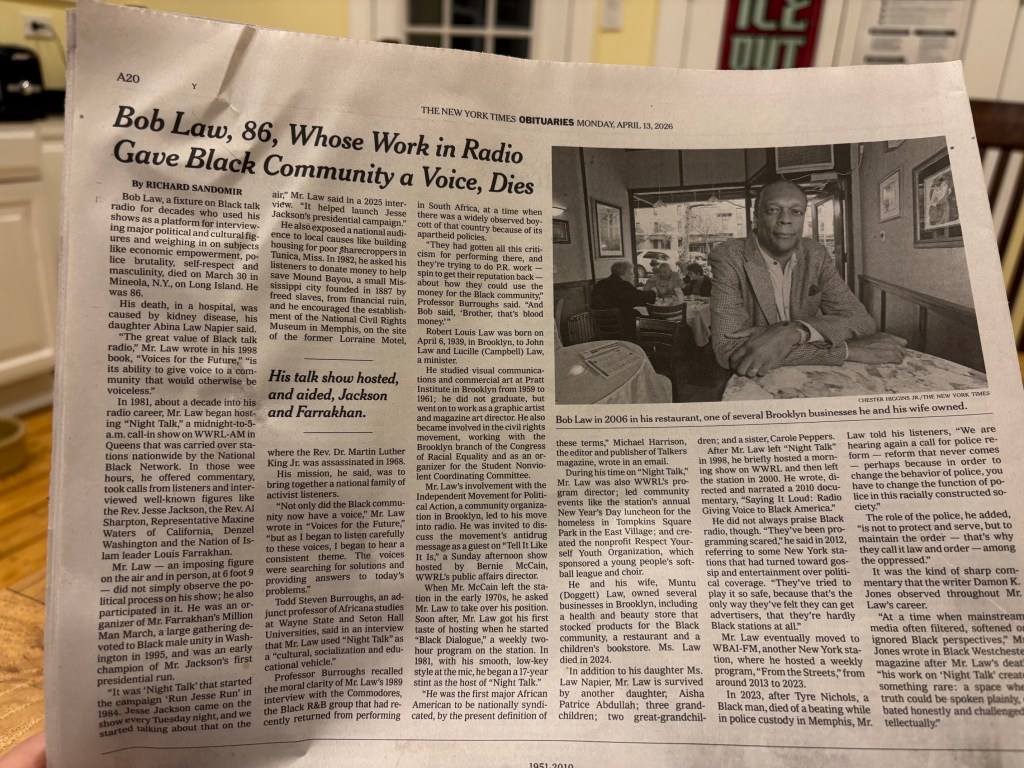 In 1981, the same year WLIB, a rival AM Black-formatted station, began Black news-talk programming, “Night Talk with Bob Law” premiered on the National Black Network, originating on WWRL. (The station’s all-night slot had been held by Law’s friend Gary Byrd, who soon moved his “Gary Byrd Experience” show down the dial to WLIB; more on his story here.) “Night Talk” with Bob Law was the first national Black radio call-in talk show. It ran weeknights, from midnight to 5 a.m., Monday through Friday mornings. It was a national forum for Black issues in the news and Black politics. One scholar said it “quickly became the most popular Black talk radio show in the country.”