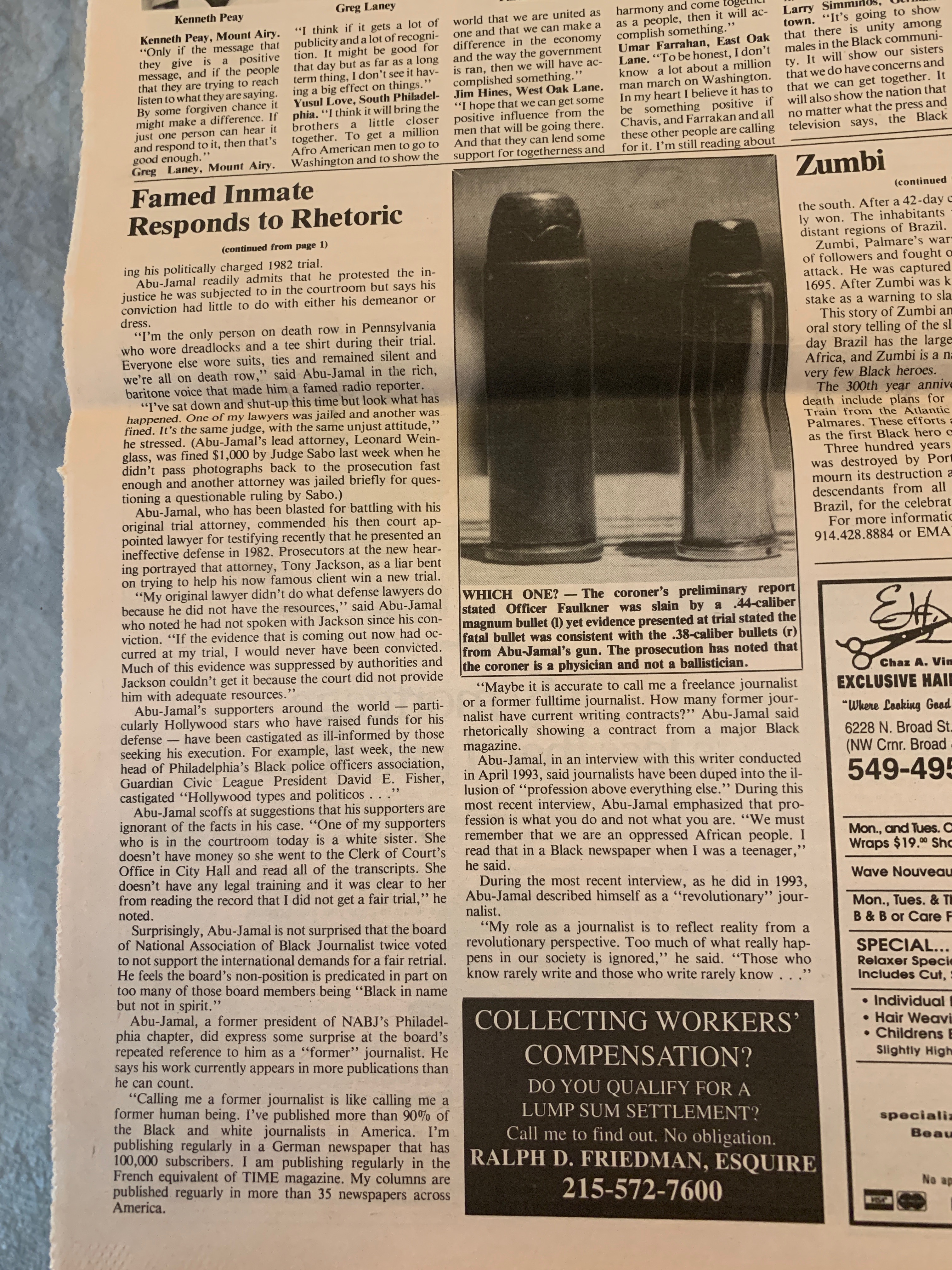 Compiling an anthology about Abu-Jamal, and Linn Washington gave me this article, published shortly after Abu-Jamal escaped the guillotine the first time a quarter of a century ago. It reminds me of dose days, when I was a part-time intern at the National Newspaper Publishers Association and constantly surrounded by Black newspapers. I always had a soft spot for The Philadelphia New Observer because it would print these huge, remarkable 20,000-word Black/Afrikan history supplements by James G. Spady, then a Black Philadelphia living institution.