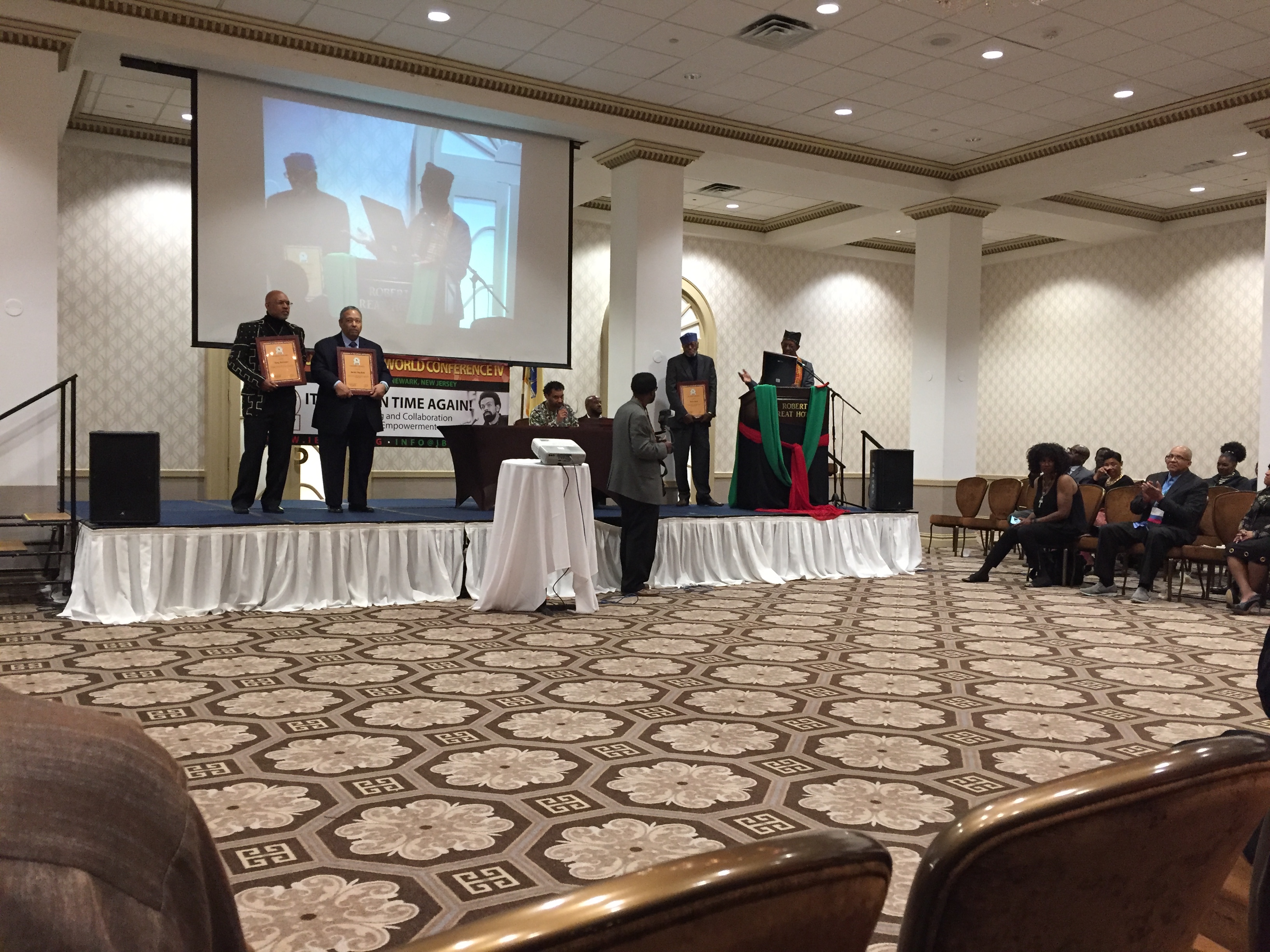 ….historian/journalist Herb Boyd (holding award, next to IBW president Ron Daniels on podium), who received an Institute of the Black World-21st Century Legacy Award Saturday at the IBW’s “State of the Black World” conference in Newark, N.J.